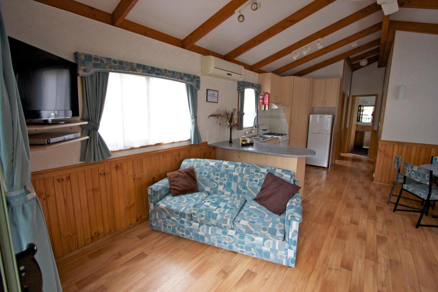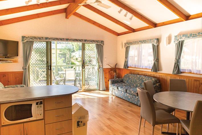 Deluxe Family Villa. This villa is our largest and features 2 bedrooms and a spacious living area. The main bedroom has a queen size bed with an electric blanket, a walk-in wardrobe and a TV. The second bedroom has 2 sets of bunks (4 singles). Other facilities include a modern bathroom with hairdryer, fully-equipped self-contained kitchen with stove, oven, microwave, fridge and a large pantry. The large living area has 2 x 3-seater couches and a 6-seater dining set, a TV & DVD player and remote controlled reverse cycle airconditioning.linen and towels are supplied. The Deluxe Villa has a balcony with an outdoor setting andvillas overlook the heated pool. Please note that the rate is based on 2 guests. Maximum occupancy is 6 (see Hotel Policies). ;