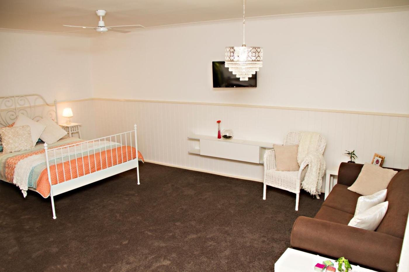 Cottage with Garden View. This cottage has a queen bed and a sofa bed. There are plush towels that are changed daily. The kitchen isup withcutlery and crockery, pots, pans and a wok. There is a microwave, fridge, kettle, toaster and sandwich maker. Just outside your door there is a full gas BBQ area. In the cupboards are a selection of games to enjoy, the bookself holds a variety of books to read, and there is also a DVD library. Your lounge area features a swivel TV that can be watched fromangles in the guest house.