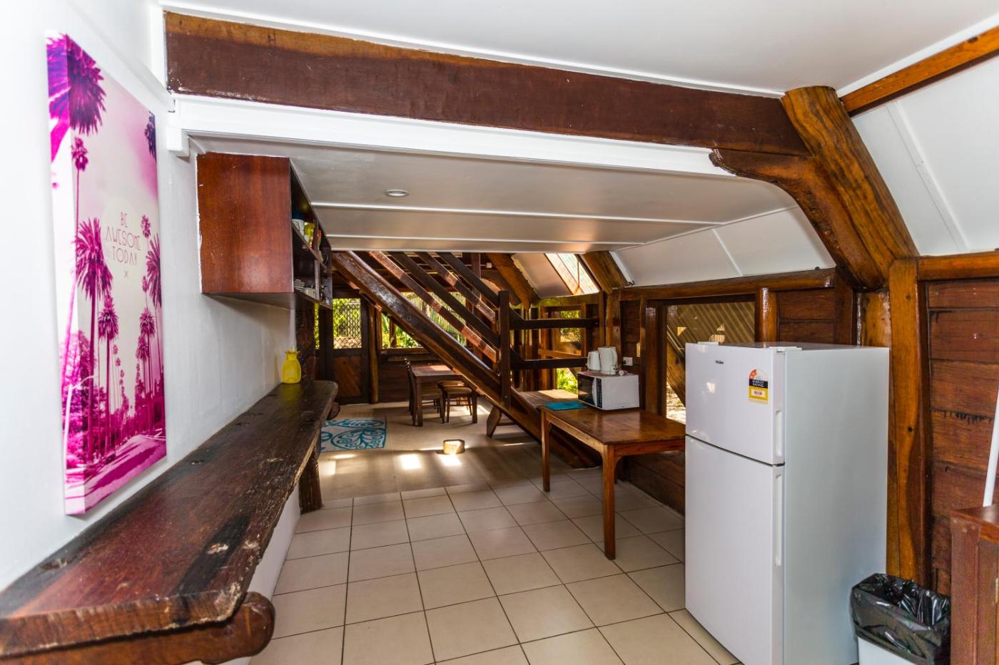 Holiday Home. This open-plan A frame holiday home includes a kitchenette with basic cooking facilities (microwave, electric frypan and BBQ), and a lounge and dining room downstairs which opens onto a fully fenced garden area. The bathroom and 2 queen beds are located upstairs and 2 single beds and a 3rd queen bed are downstairs. Maximum preferred guests is 6. Full linen is provided for your stay. Towels are refreshed every 4th day along with your linen, or on demand for a charge. Guests will need to bring their own beach towels. Please note that to get to the property from Yeppoon, you will need to catch a ferry service, organized by the property at a surcharge. Please contact the property, using the contact details found on the booking confirmation, to arrange this ferry service. It is important that this is organized prior to arrival and that guests let the property know their expected time of arrival as the ferry has limited departing times. ;