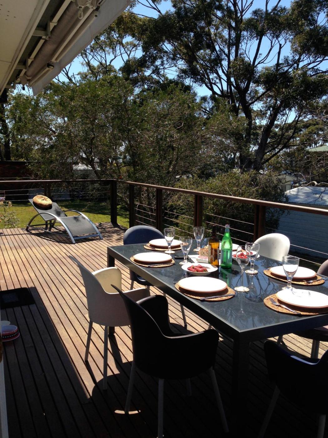 Two-Bedroom House. This retro-style beach house features views of Hyams Beach and Jervis Bay from kitchen, lounge room and deck area. Relax outdoors on the wrap around deck or use the BBQ facilities. There are indooroutdoor dining areas, a fully equipped kitchen as well as a flat-screen TV and DVD player. You can listen to a tune from the electric vinyl collection, or enjoy your own tunes using the Bluetooth sound system. Also on offer are a washing machine and a bathroom. There are eco-friendly whisper quiet ceiling fans to maximise the comfort of your stay.