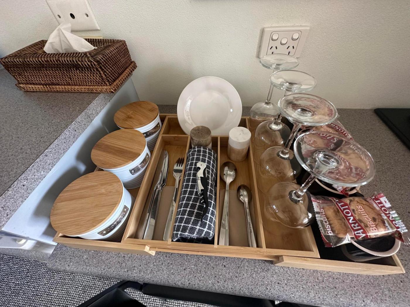 Shared stationery such as printed menus, magazines, pens, and paper removed