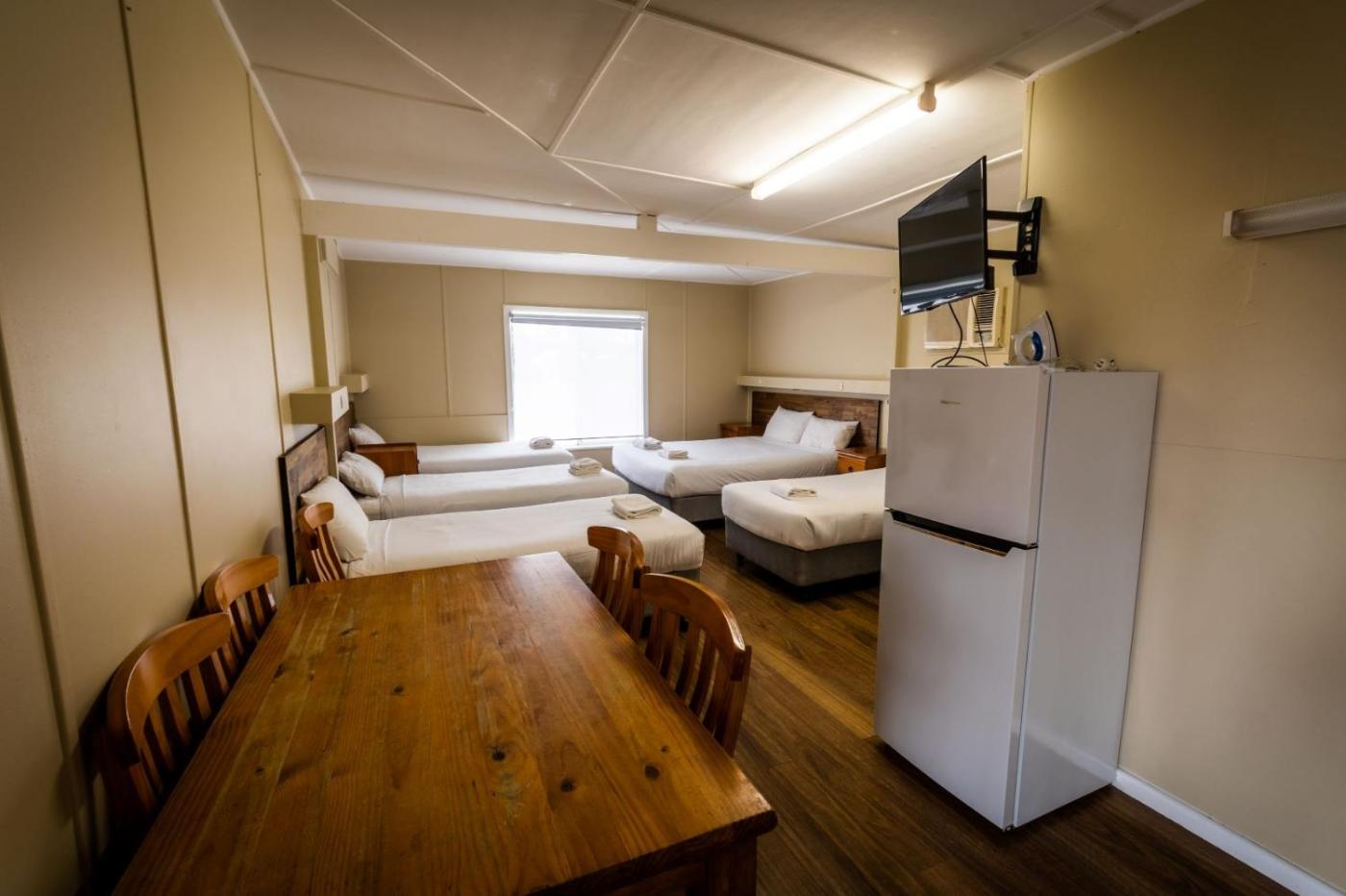 Family Room (6 Guests). This family room has a toaster, microwave, air conditioning, utensils, cutlery, mini fridge and flat screen TV. En suite which comes with a walk-in shower. Please note this room cannot accommodate pets. ;